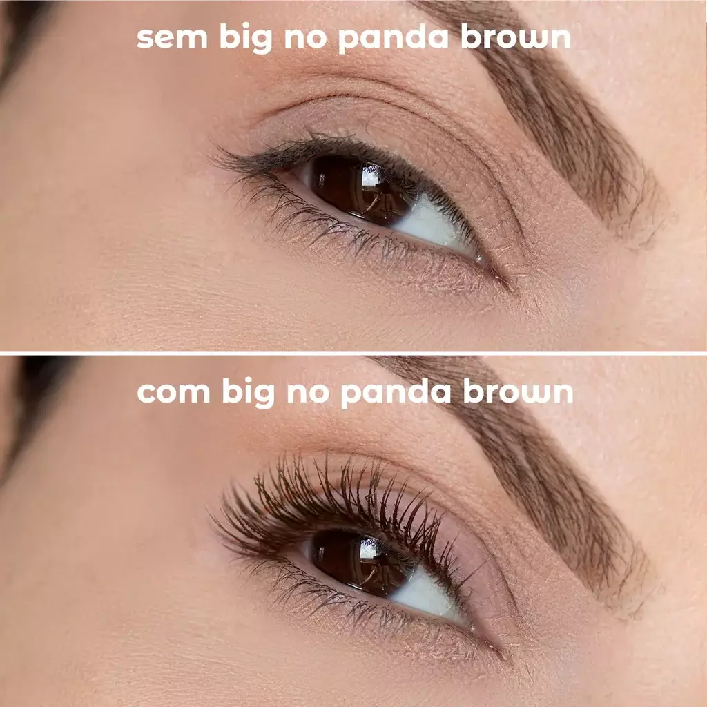 Com pigmentação marrom, a máscara Big No Panda Brown Vizzela entrega um look sofisticado, natural e delicado, realçando a maquiagem de forma elegante. Conta com a tecnologia NO PANDA, que não mancha e sai dos cílios em forma de película com água morna. O aplicador BIG curvado proporciona volume, definição e curvatura, deixando o olhar ainda mais destacado.